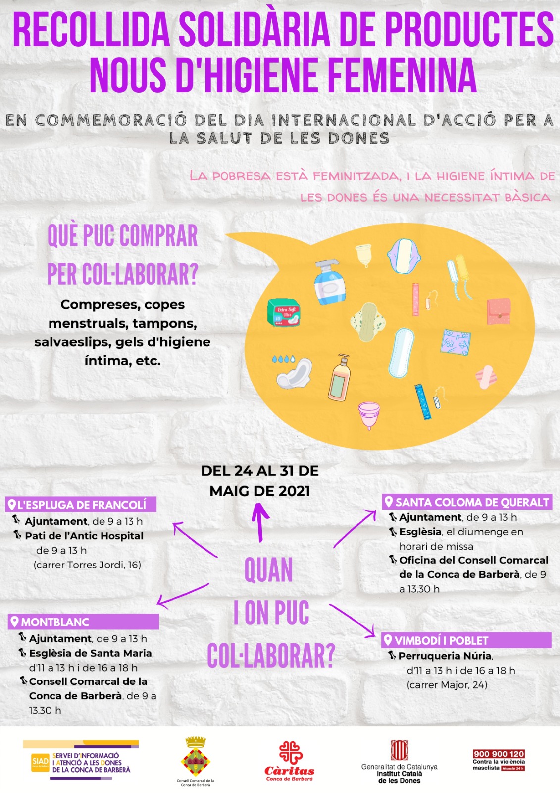 També es farà una recollida solidària de procutes nous d'higiene femenina.