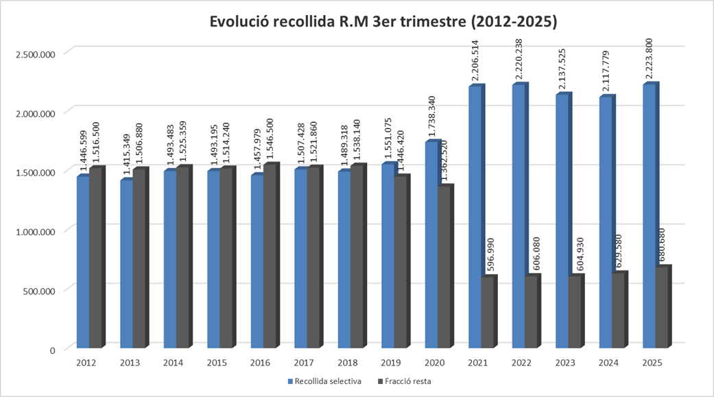 Durant el tercer trimestre de 2025, s’han recollit 2.223,8 tones de residus de recollida selectiva, davant de les 680 tones de fracció resta