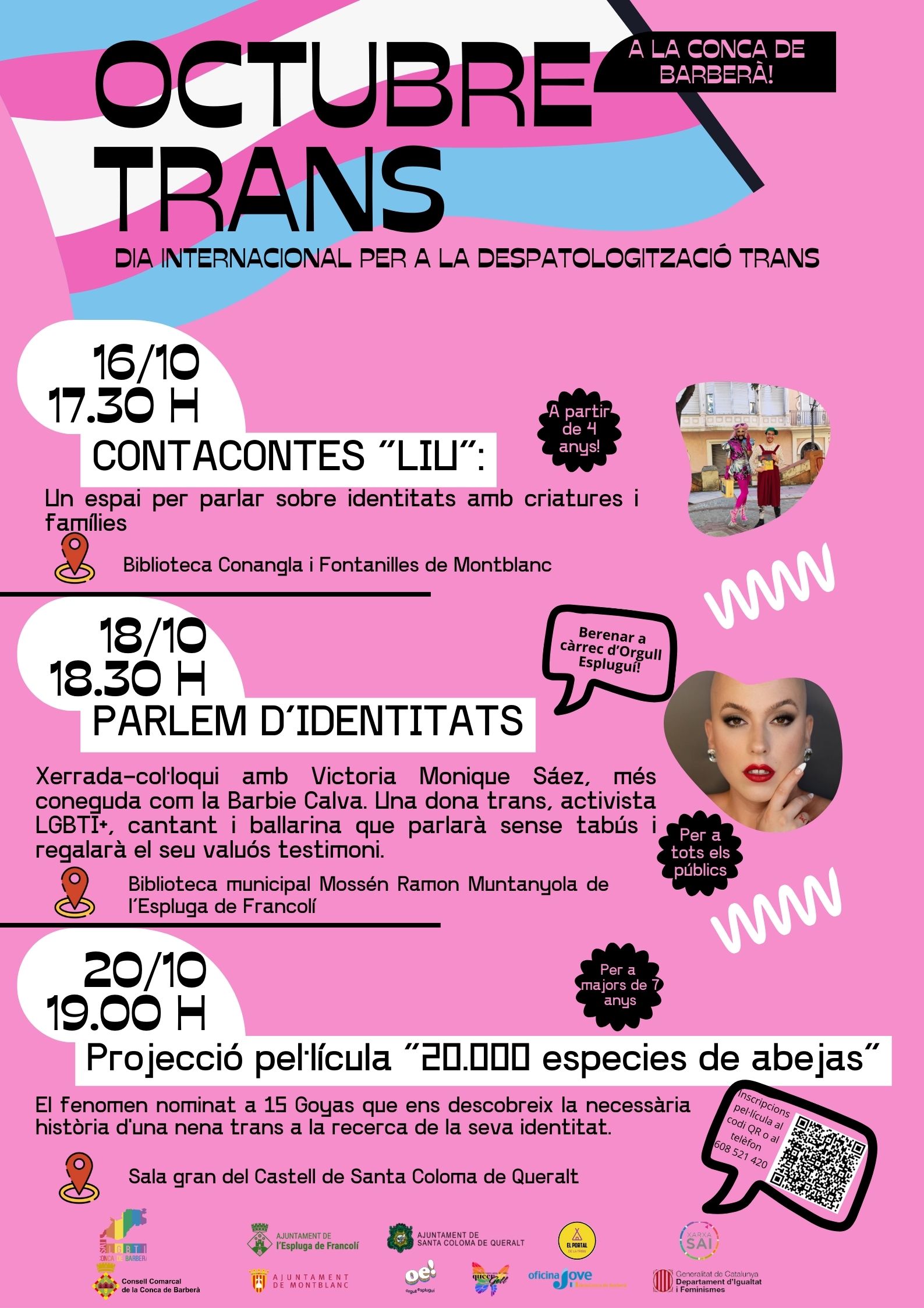Així doncs, en el marc del mes d'octubre per a la despatologització de la realitat trans, el Servei d'Atenció Integral (SAI) per a persones LGTBI+ de la Conca de Barberà ha promogut activitats gratuïtes per a tots els públics: Dimecres 16 d'octubre a les 17:30 h i amb la col·laboració del Portal de Tribu, el Contacontes Liu, un espai per parlar sobre identitats amb criatures i famílies a la biblioteca Conangla i Fontanilles de Montblanc. Divendres 18/10 a les 18:30 h, i amb la col·laboració de l'Associació Orgull Espluguí que portarà berenar, xerrada-col·loqui amb Victoria Monique Sáez, més coneguda com la Barbie Calva; una dona trans, activista LGBTI+, cantant i ballarina que parlarà sense tabús i regalarà el seu valuós testimoni, a la biblioteca mossèn Ramon Muntanyola de l'Espluga de Francolí. I per finalitzar, diumenge 20/10 a les 19:00h a la Sala Gran del Castell de Santa Coloma de Queralt, es projectarà la pel·lícula "20000 especies de abejas" nominada a 15 Goyas, que ens descobreix la necessària història d'una nena trans a la recerca de la seva identitat. Per aquesta última activitat caldrà inscripció prèvia entrant al codi QR o enviant WhatsApp al telèfon 608521420.