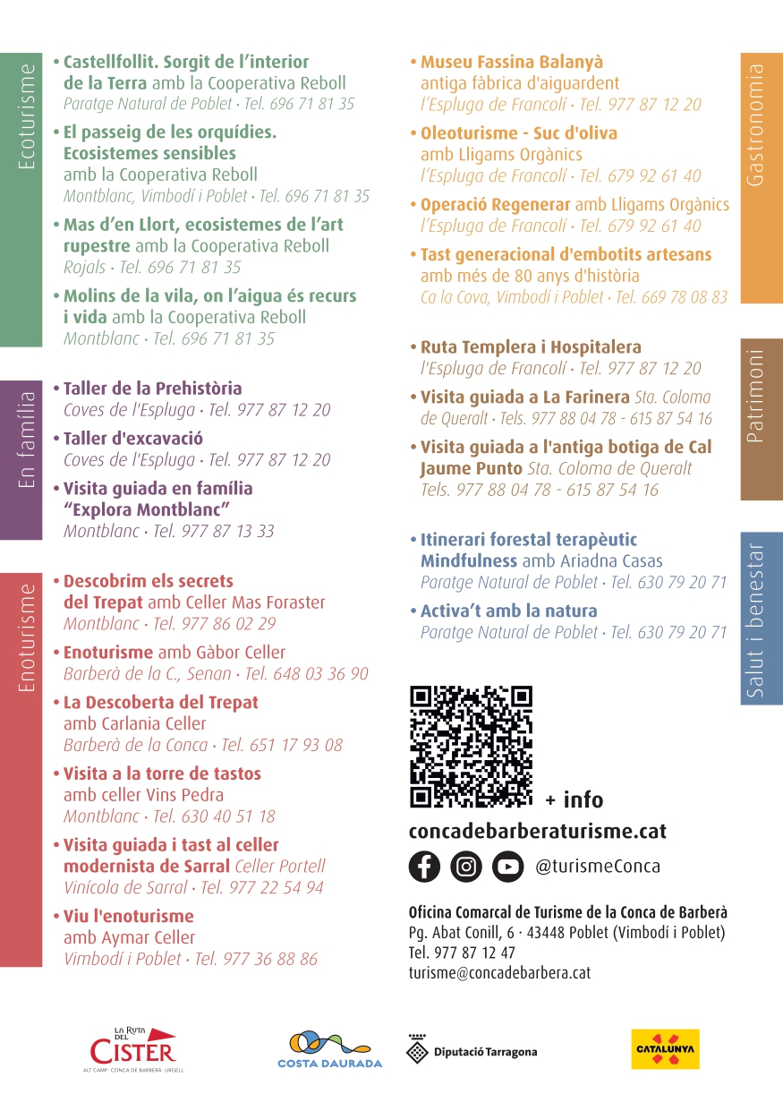 Per a més informació sobre les Propostes En Pot Petit a la Conca de Barberà 2025 i per consultar el nou flyer, visiteu la web oficial del Consell Comarcal de la Conca de Barberà (https://concadebarberaturisme.cat/o seguiu-nos a les nostres xarxes socials (@turismeconca).
