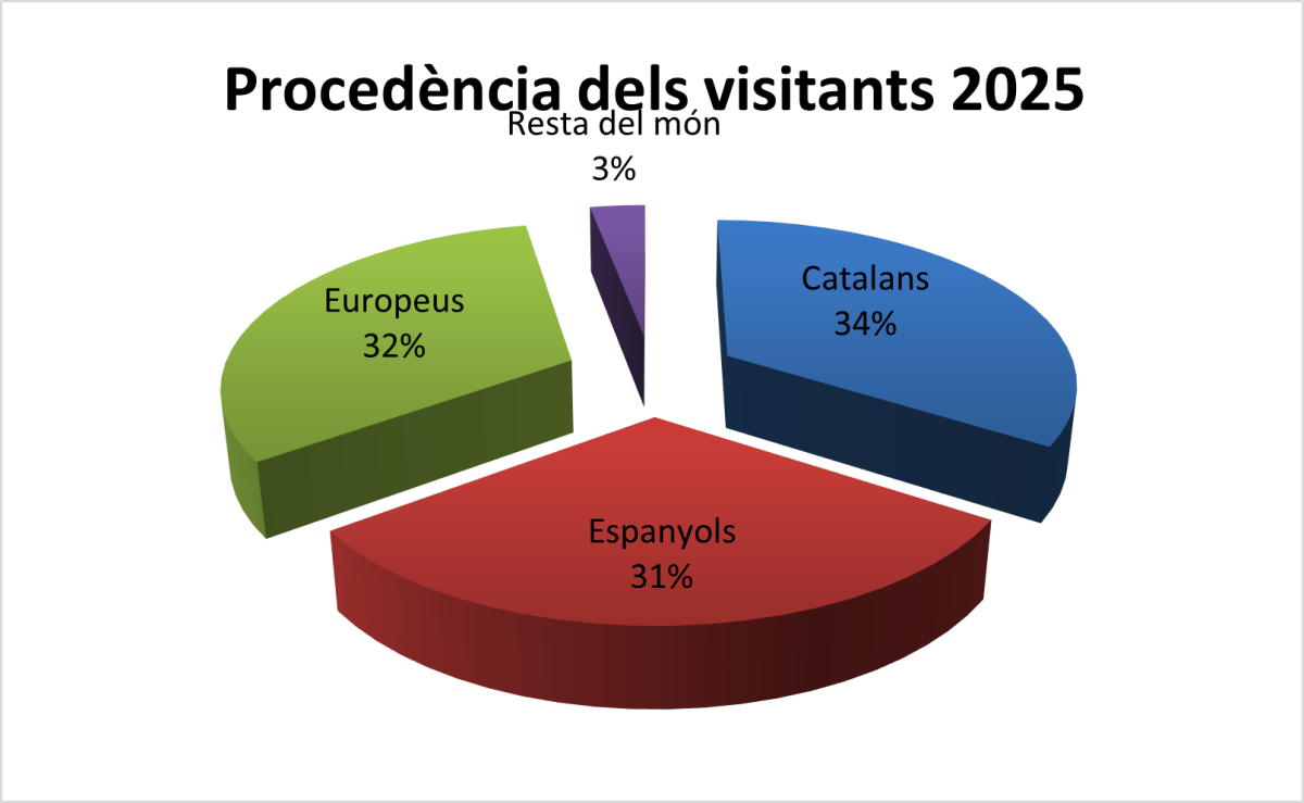 En segon lloc, trobem els visitants procedents d’Europa que representen un 32% del total (17.542 persones). En relació amb aquest mercat, els principals visitants són majoritàriament francesos (58%). En segon lloc, destaca visitants procedents d’Alemanya (17%); així com de Bèlgica (6%), Itàlia (5%), Rússia (3%), el Regne Unit (3%), i Holanda (2%).