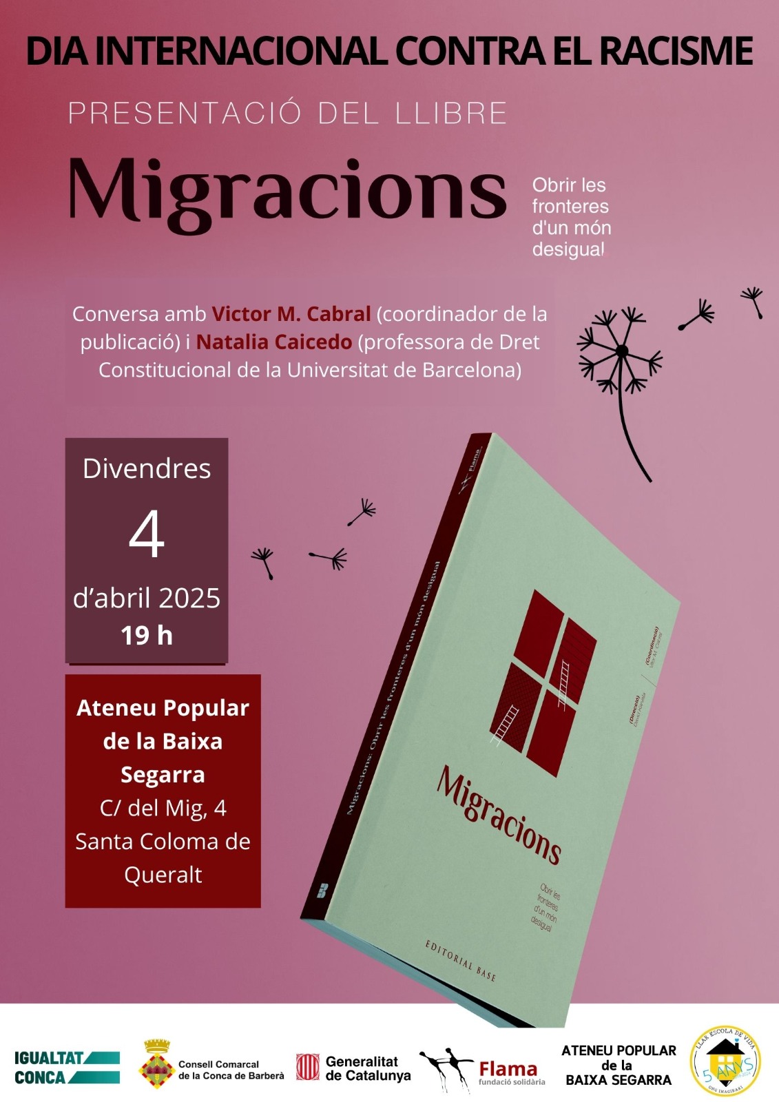La presentació del llibre tindrà lloc el divendres 4 d’abril a les 19 h a l’Ateneu de la Baixa Segarra, situat al C/ del Mig, 4 de Santa Coloma de Queralt. L'acte comptarà amb la presència de Víctor M. Cabral Rodrígues, coordinador del llibre i de la Fundació Solidària La Flama, i de Natàlia Caicedo Camacho, professora de Dret Constitucional de la Universitat de Barcelona i investigadora en immigració i drets socials.