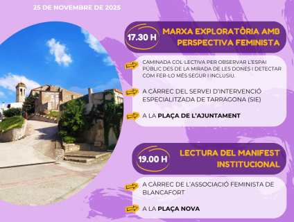 En finalitzar la marxa, es farà la lectura institucional del manifest del 25 de novembre a la plaça Nova, a càrrec de l’Associació Feminista de Blancafort. L’acte conclourà amb un pica-pica gratuït ofert per l’Ajuntament de Blancafort.